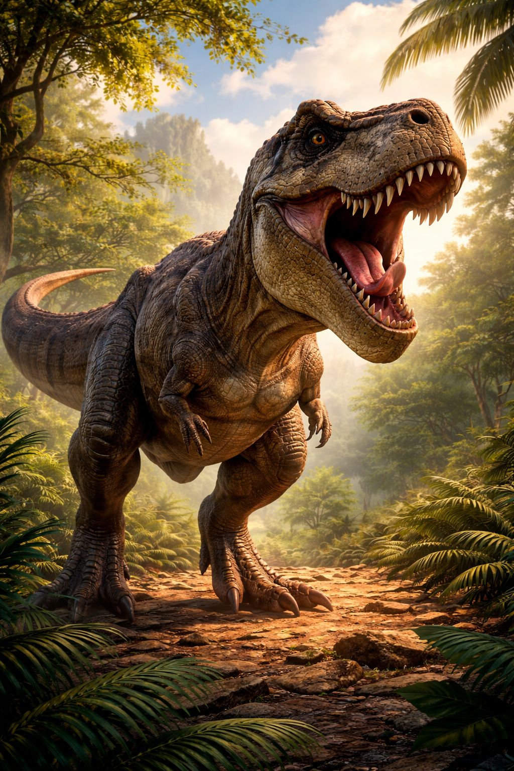Com mandíbulas extremamente fortes e dentes serrilhados do tamanho de facas, o T. rex era um superpredador no topo da cadeia alimentar. Sua visão aguçada e olfato apurado ajudavam na caça, tornando-o uma verdadeira máquina biológica de sobrevivência.